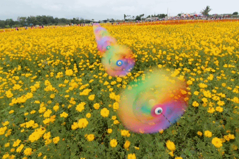 把快門速度調慢拍起來,就像是一顆顆的彩虹球在花田上旋轉呢!!